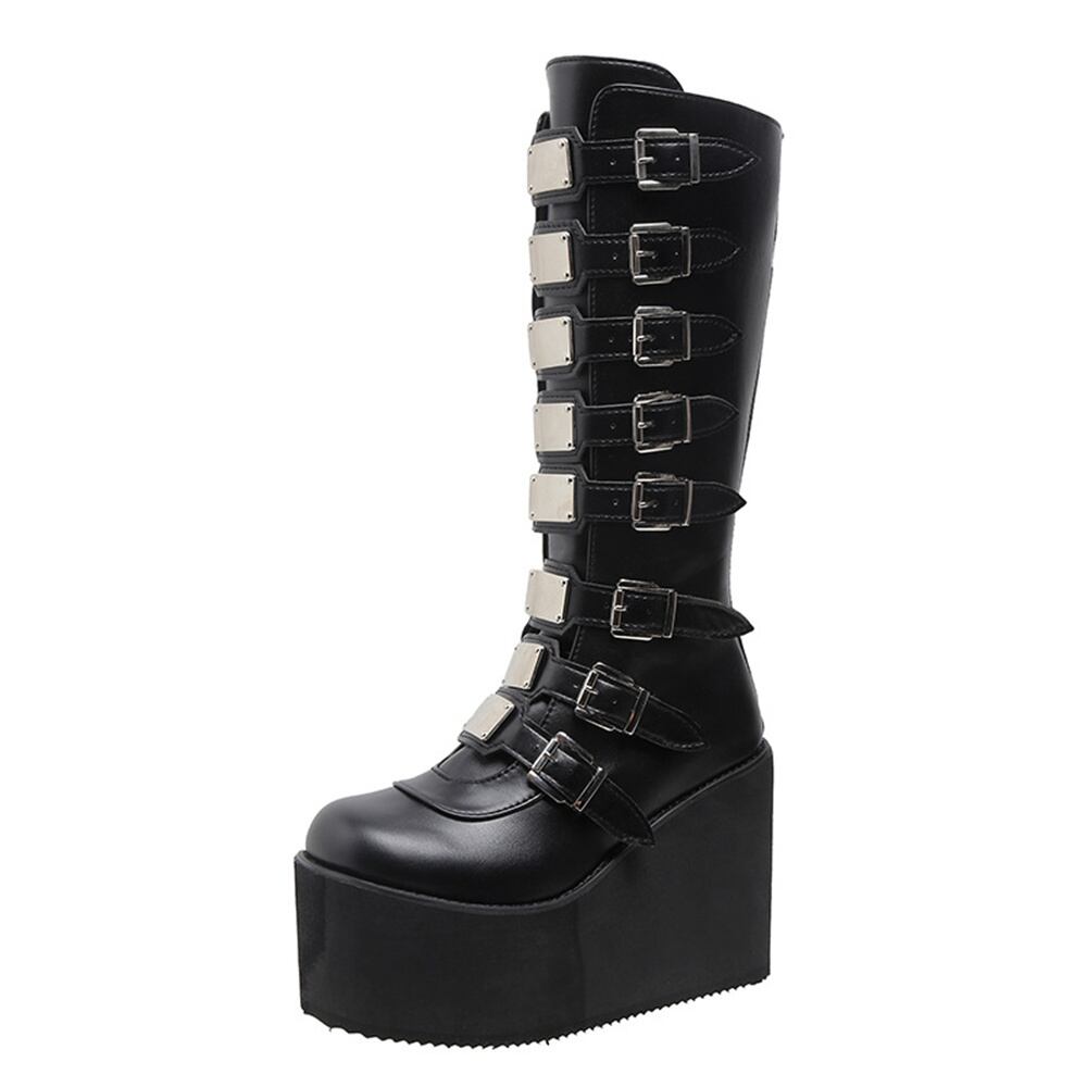 X3008ブーツ 厚底 ロング 黒ブーツ レーザー長靴 ゴシック レディース ロリータ シューズ コスプレ靴 コスプレシューズ 大きいサイズ