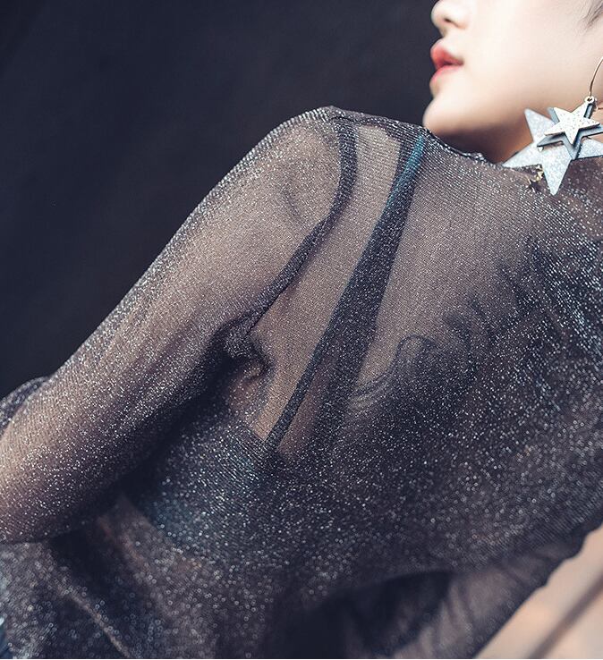 9022レディーストップス レースシャツ ラメ入り シアーシャツ 長袖 メッシュ アミアミ 網 かわいい 透け透け シースルー セクシー