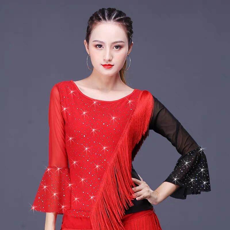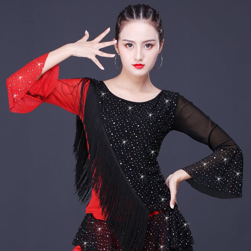 社交ダンス衣装 ダンスウェア レディース トップス 長袖 スパンコール フリンジ フリル 社交ダンス ラテンダンス フラメンコ衣装 練習着 大きいサイズ t0701